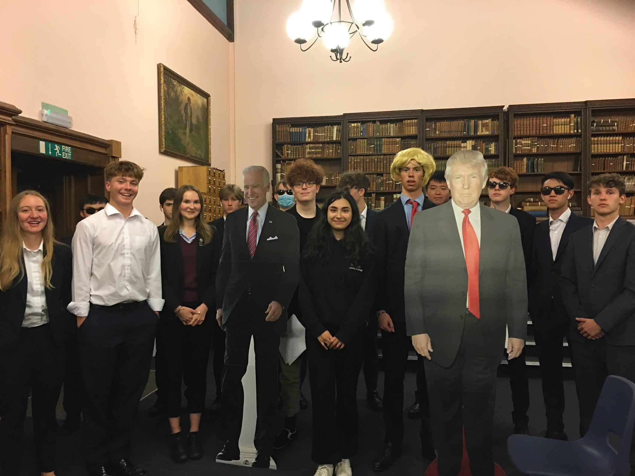 Lancing College hosted a US Presidential Debate in the run-up to the actual elections on 3 November. Three Joseph Bidens (Shirin M, Christina L and Felix I) took on three Donald Trumps (Barney H, Emily B – and Isac I with wig, orange make-up and a Secret Service Team) to fight it out in the Sanderson Room.